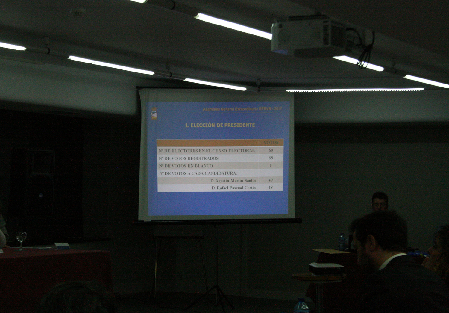 Agustín Martín Santos recibió 49 de los 68 votos totales emitidos de miembros de la Asamblea, por lo que fue designado para presidir la RFEVB durante los próximos cuatro años. El plebiscito se saldó con el resultado de 49 votos a favor de Agustín Martín Santos, 18 votos para Rafael Pascual y 1 voto en blanco. El recién elegido presidente federativo abogó por la unidad de todo el voley nacional para seguir trabajando por el progreso de este deporte.