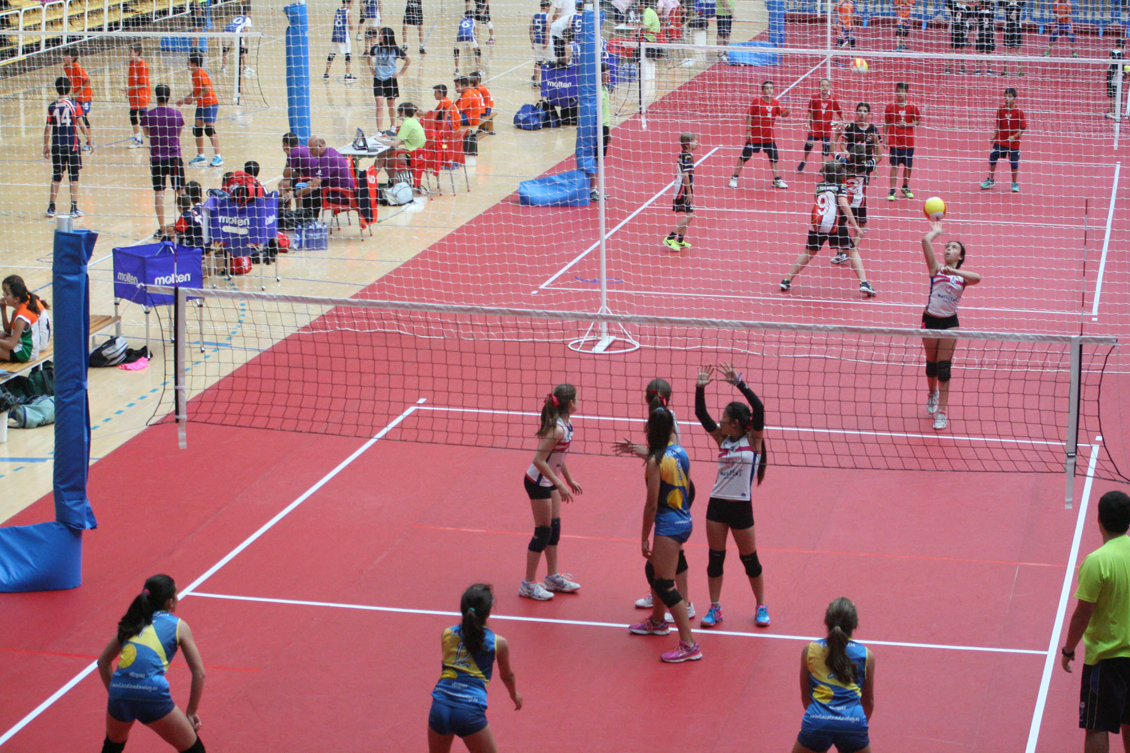 La primera edición del Campeonato de España Alevín de voleibol ha comenzado en la mañana del viernes en el Polideportivo Pisuerga de Valladolid. 16 pistas dentro del histórico recinto vallisoletano albergan la gran fiesta del vóley de cantera nacional, con 64 equipos, 32 en cada categoría que que plasmarán en los próximos tres días sus ganas, su esfuerzo e ilusión en un espectacular evento.
