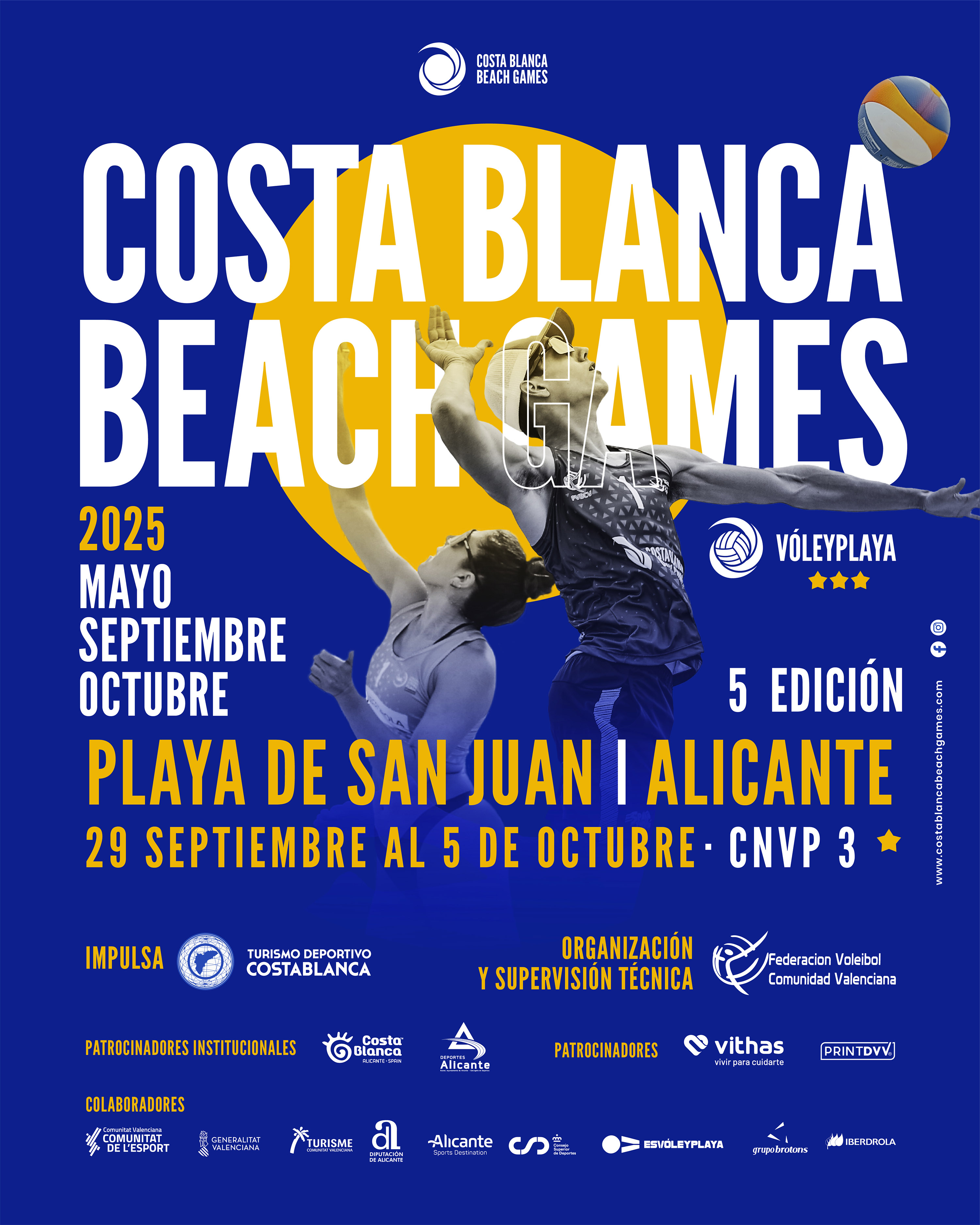 La Playa de San Juan volverá a convertirse en el epicentro del vóley playa nacional una vez más con motivo de la quinta edición de los Costa Blanca Beach Games. Alicante acogerá, del 2 al 5 de octubre, una prueba tres estrellas del Circuito Nacional de Vóley Playa en un estadio construido sobre la arena para la ocasión con capacidad para 300 espectadores. La entrada es gratuita todos los días, incluido el domingo, cuando se disputarán las finales a las 14:00 horas.