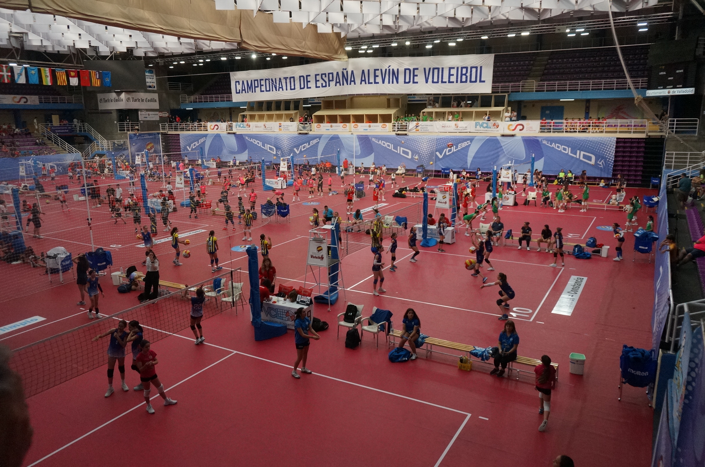 El octavo Campeonato de España Alevín que se disputa en Valladolid completó este viernes su jornada inaugural en un emocionante viernes en el que las 16 pistas de juego, repartidas entre  el Polideportivo Pisuerga y el Polideportivo Pilar Fernández Valderrama, marcaron la ruta hacia el título de los 64 conjuntos participantes.