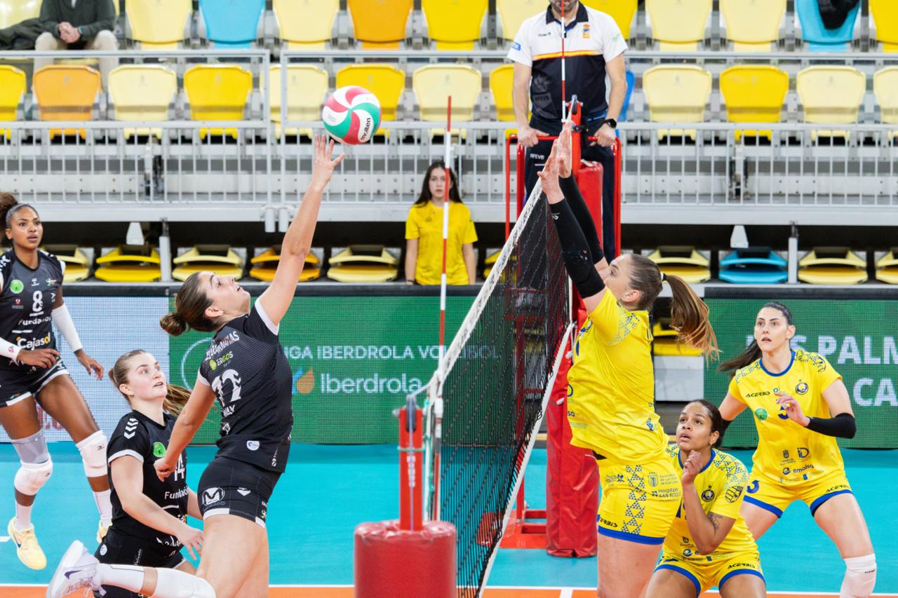 El duelo volvió a igualarse en el tramo final (23-23), pero fue Saray Manzano la que decantó el primer acto con un ataque, primero, y un bloqueo, después, que adelantaba a las grancanarias (25-23).