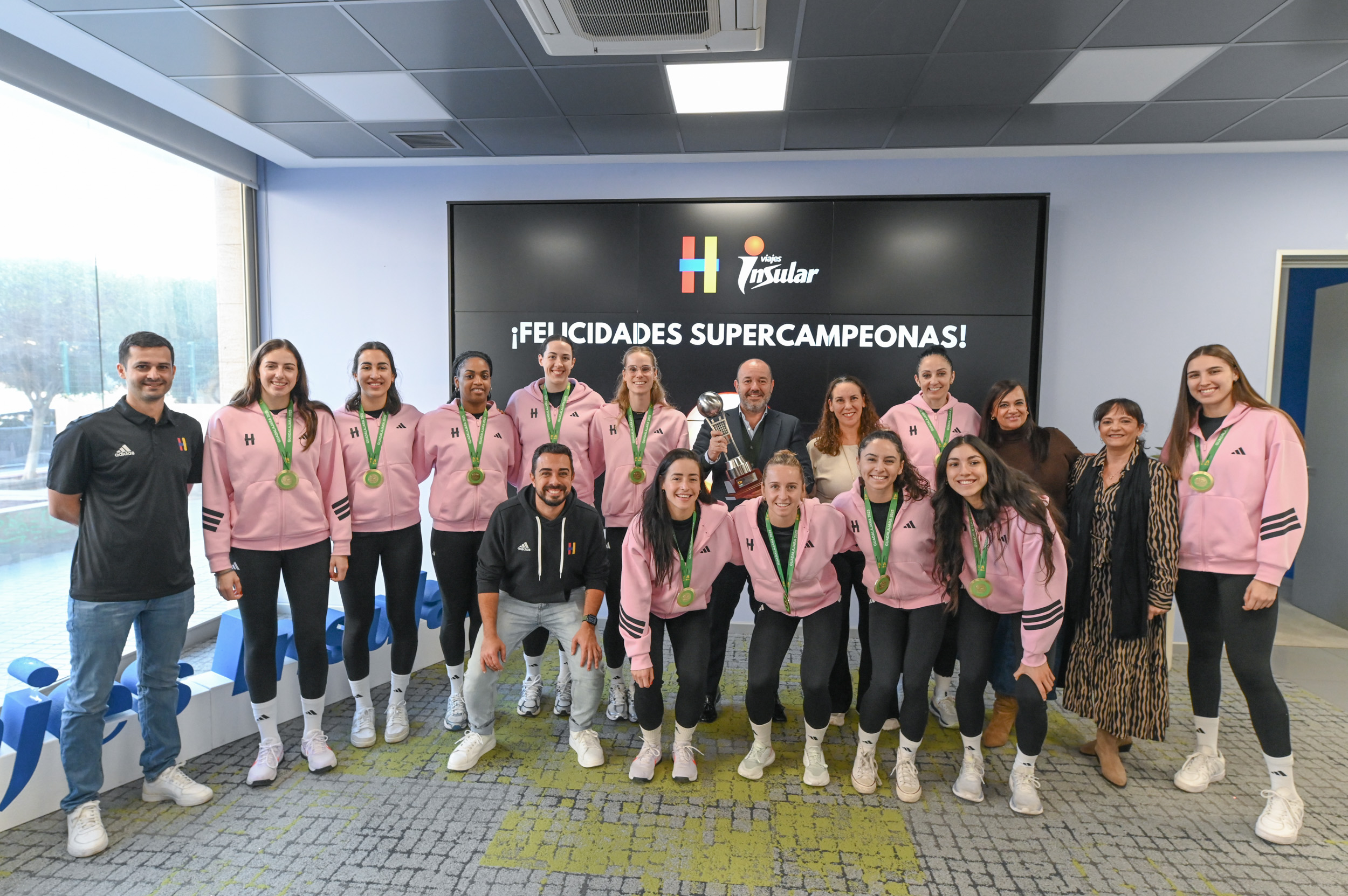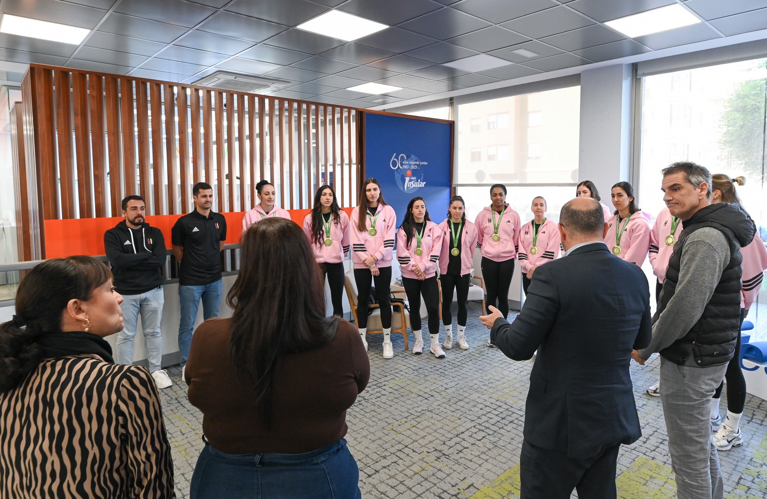 La mañana de recepciones empezó en las instalaciones de Viajes Insular S.A., patrocinador y gestor de viajes del Heidelberg Volkswagen. La plantilla recibió el cariño del personal de la empresa y fue felicitada por el director general de la compañía, Ignacio Poladura, que resaltó el "orgullo y satisfacción" que supone el título de Supercopa de España del club y las excelentes relaciones entre ambas entidades.