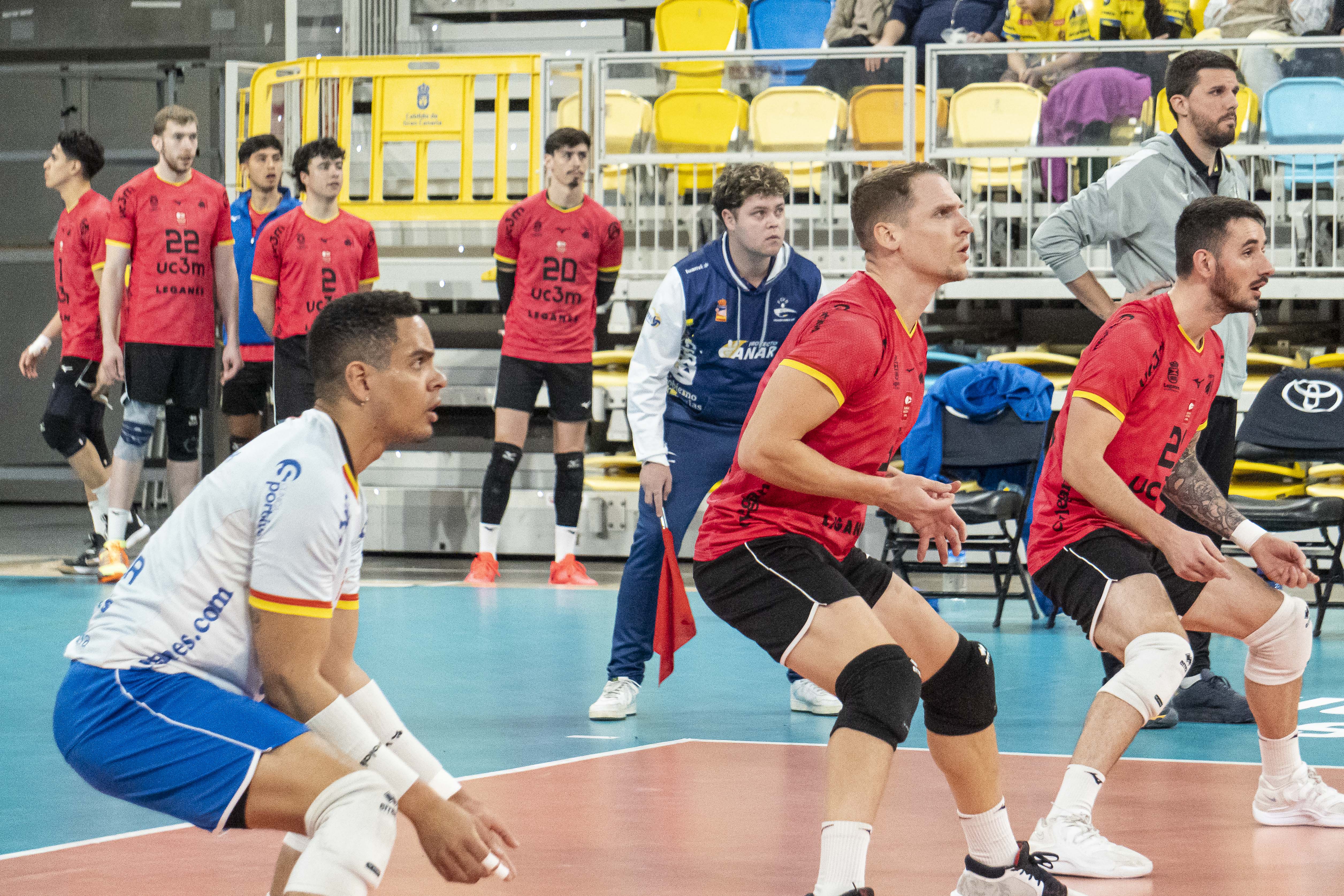 El campeón CV Guaguas no dio opción a UC3M Voleibol Leganés. El conjunto de Sergio Miguel Camarero trasladó a la competición nacional el buen momento mostrado en la CEV Champions League y dominó con un gran saque y bloqueo a los madrileños. La pegada de Wallas Bezerra (aportando también en bloqueo) y los saques de Osmany Juantorena permitía a los grancanarios controlar el marcador en todo momento para ampliar su liderato tras la derrota del segundo clasificado.