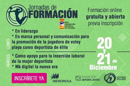 Tienes una cita doble. Reserva en tu agenda los días 20 y 21 de diciembre y acompáñanos a las jornadas de formación que hemos preparado especialmente para ti como deportista de elite. Será una formación online, gratuita previa reserva de plaza, que celebraremos a través de la plataforma Zoom. Para todos los públicos relacionados con el vóley tanto de playa como de pista.
