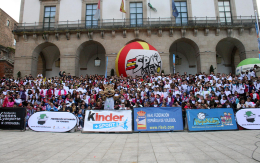 La Plaza Mayor de Cáceres fue tomada por más de ochocientos deportistas en las horas previas a la celebración de la final de la XLI Copa del Rey. La localidad extremeña acogió uno de los eventos Pequevoley más espectaculares y multitudinarios, un acto en el que estuvieron presentes miembros de varios de los conjuntos participantes en el torneo del KO y que disfrutaron del esfuerzo y la ilusión de los más jóvenes jugadores.