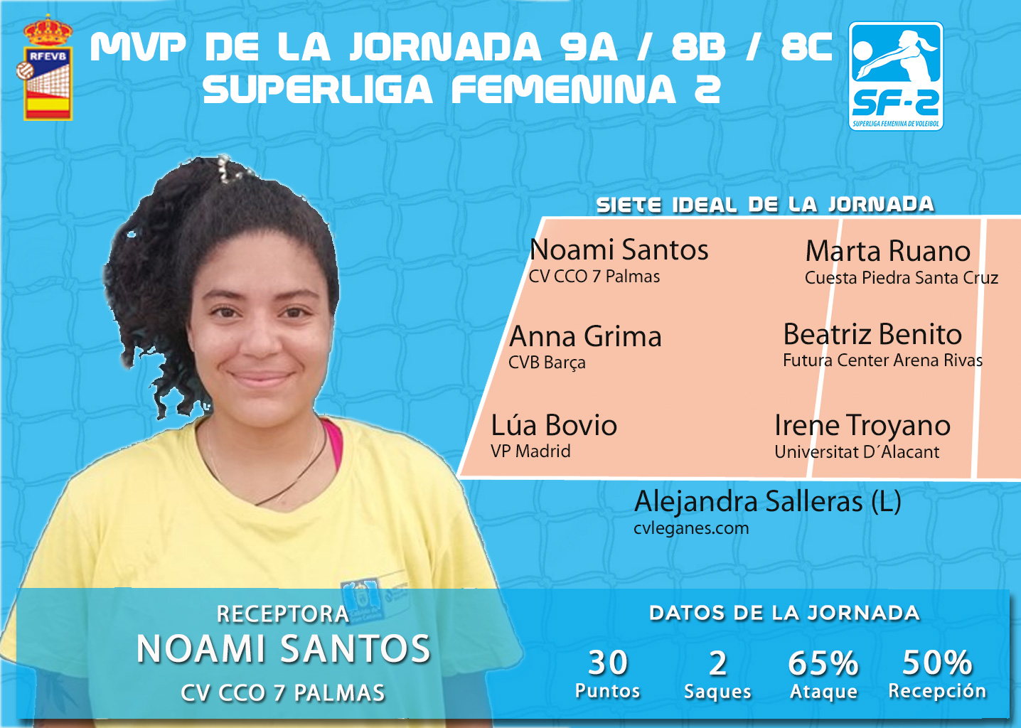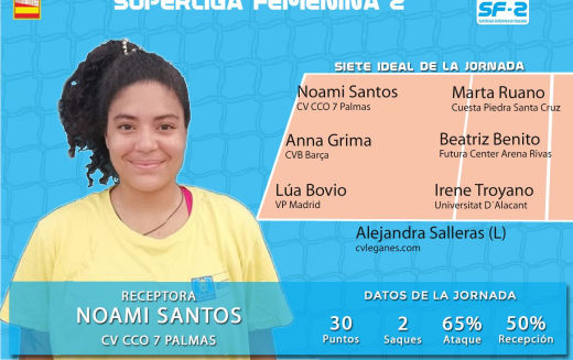 La receptora de CV CCO 7 Palmas Noami Santos es la MVP de la novena jonrada de la Superliga Femenina 2. La portorriqueña fue la máxima anotadora y atacante del fin de semana, siendo determinante en el triunfo en el desempate en el derby grancanario ante CD Heidelberg Mr. Kale