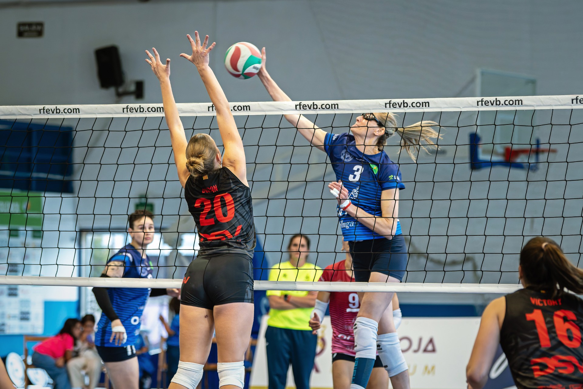 El choque comenzó igualado (10-10), con un Sant Cugat más acertado en ataque gracias a la eficacia de Maira Westergaard. Vicky Vivas intentó responder con varios remates, pero un bloqueo sobre Natália Martins acercó a las visitantes al primer set (17-24). Un ‘block-out’ de Aurora Tur, que había entrado por Vivas, dio un respiro momentáneo, aunque Lopes cerró el parcial con autoridad (18-25).